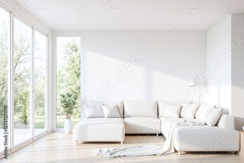Fototapeta premium Modern living room window white sofa lamps side table plant