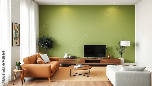© Json, Fototapeta premium Modern living room with a green accent wall and minimalist furniture, creating a serene and stylish space.