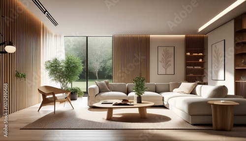 Fototapeta premium Modern living room with a minimalist design and wood accents. 3D Rendering