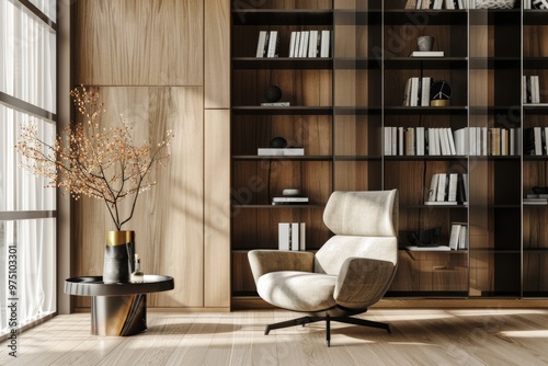 © Victor Bertrand, Fototapeta premium Modern living room with a stylish armchair, large bookshelf with a mix of books and decor, and sunlight streaming through large windows.