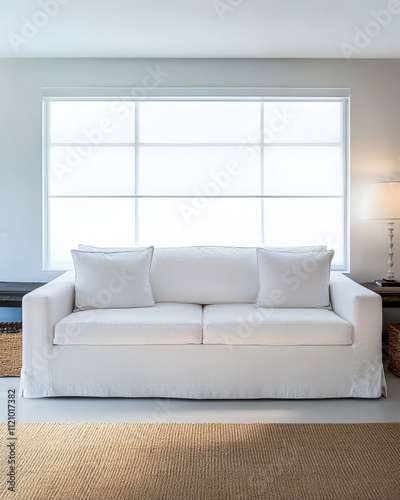 © JuanM, Fototapeta premium Modern living room with a white sofa next to a bright window and a woven rug