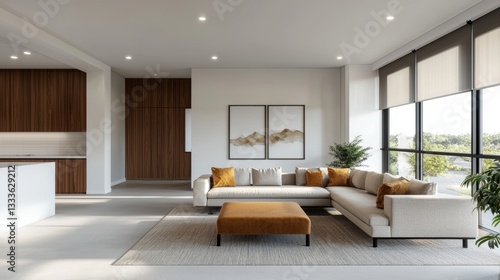 © Enjoy, Fototapeta premium modern living room with beige sectional sofa, orange accents, and large windows offering natural light