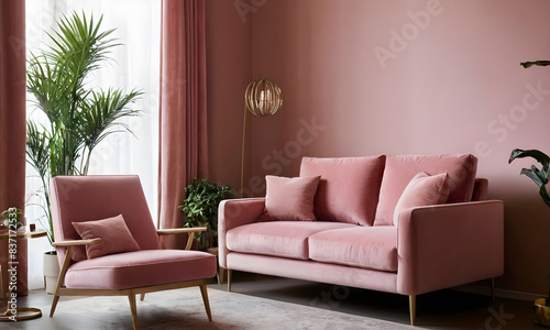 Fototapeta premium Modern living room with chic pink sofa set, indoor greenery, and cozy...