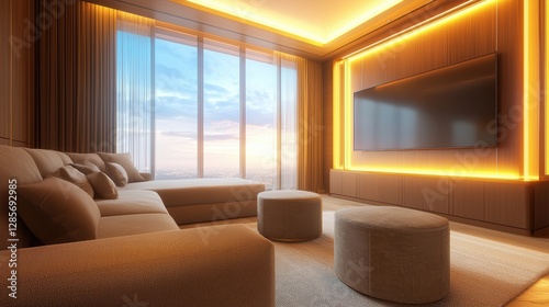 © Nucharee, Fototapeta premium Modern living room with city view.