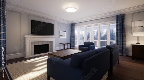 © Udin, Fototapeta premium Modern living room with cozy seating, large windows, and a scenic outdoor view