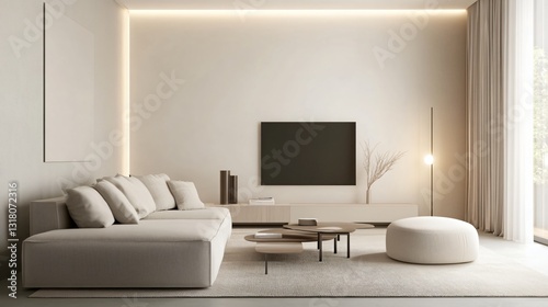 Fototapeta premium Modern living room with cozy sofa, neutral tones, soft lighting, minimalist...