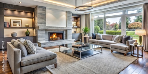 Naklejka premium Modern Living Room with Fireplace and View, living room decor, interior design, fireplace design