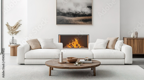 Fototapeta premium Modern Living Room with Fireplace and White Sofas