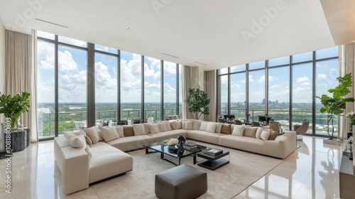 Fototapeta premium Modern Living Room with Floor-to-Ceiling Windows and City Skyline View