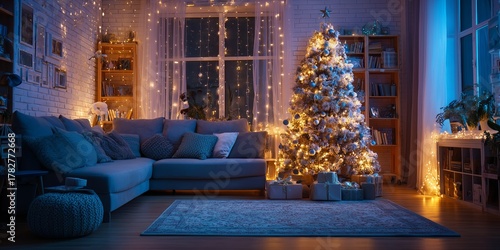 © MNStudio, Obraz premium Modern living room with glowing Christmas tree white ornaments gifts piled below city night view. Cozy urban holiday anticipation, stylish pre-Christmas home vibe.