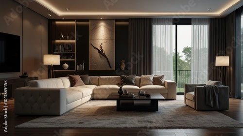 © azi, Naklejka premium Modern living room with large sectional sofa, coffee table, and floor lamps.