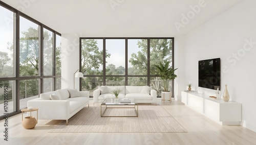 Fototapeta premium Modern Living Room with Large Windows and Comfortable Sofas