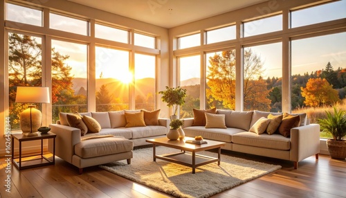 Fototapeta premium Modern Living Room With Large Windows And Sunset View