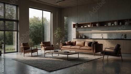 Fototapeta premium Modern living room with large windows and wooden accents.