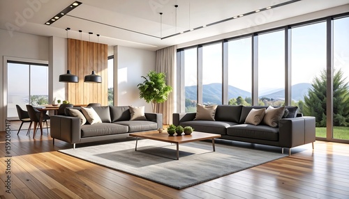 © Berkah8, Fototapeta premium Modern living room with large windows overlooking mountains