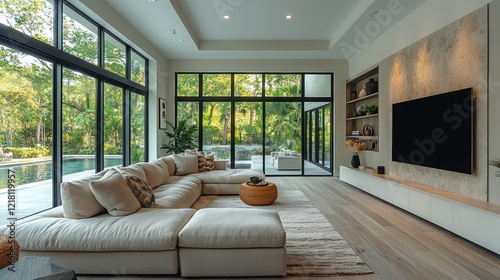 © munha, Naklejka premium Modern living room with large windows, sectional sofa, and entertainment center overlooking a pool.