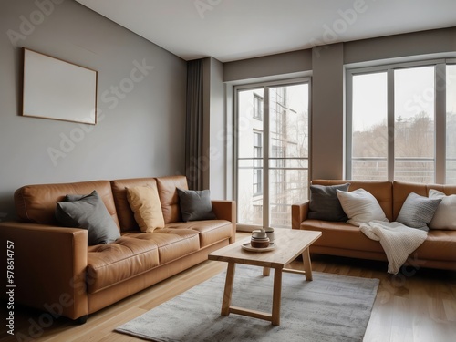 © free, Fototapeta premium Modern Living Room with Leather Sofa and Wooden Coffee Table