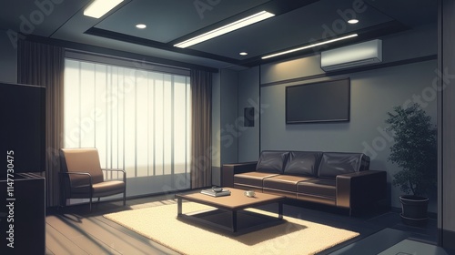 Fototapeta premium Modern living room with leather sofa, sunlight streaming through window.