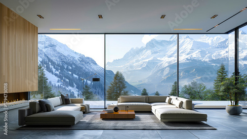 © Fleuronica, Naklejka premium Modern living room with mountain view during daytime in a snowy landscape