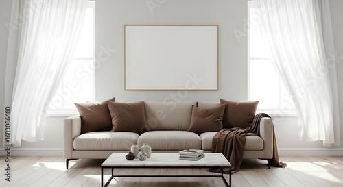 Fototapeta premium Modern living room with neutral sofa and cozy throws