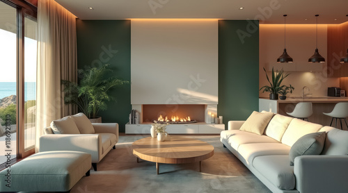 Fototapeta premium modern living room with ocean view fireplace