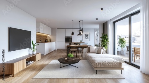 Fototapeta premium Modern Living Room with Open Kitchen and Balcony