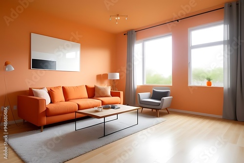 © abidali, Fototapeta premium Modern living room with orange worn-effect wall.