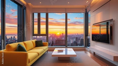 © desain, Naklejka premium Modern living room with panoramic city sunrise views.