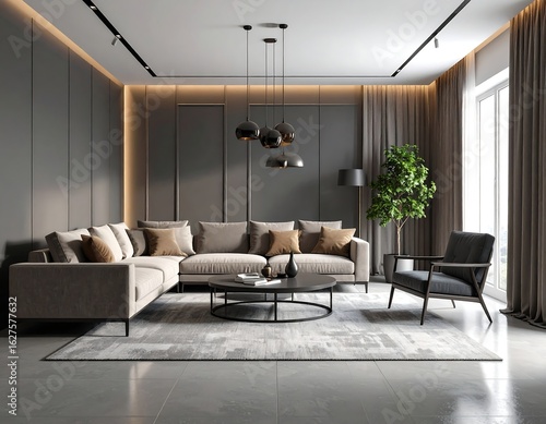 © Astifelisha, Fototapeta premium Modern living room with sectional sofa, coffee table, armchair, and floor lamp