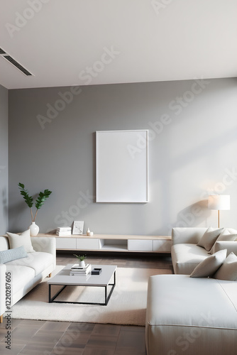 © Aran, Fototapeta premium Modern Living Room with Sleek Furniture, Neutral Tones, and Warm Lighting Featuring ISO A Paper Size Poster Frame