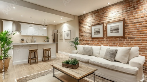 © SmirkDingo, Fototapeta premium Modern living room with stylish decor and cozy ambiance in a brick wall apartment