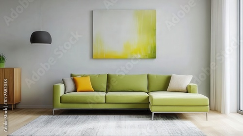 Fototapeta premium Modern living room with stylish green sofa and abstract wall art, creating a...