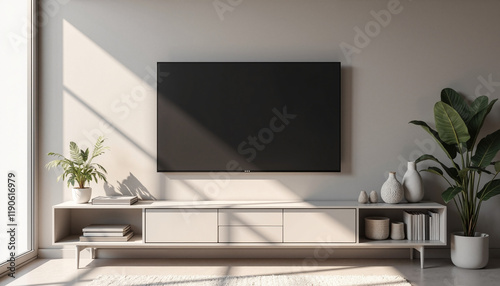 © AlenaSi, Obraz premium Modern living room with TV and decorative plants