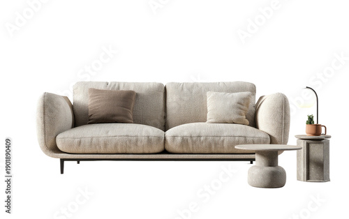 Fototapeta premium Modern living space with a neutral sofa, side table, lamp, and cactus