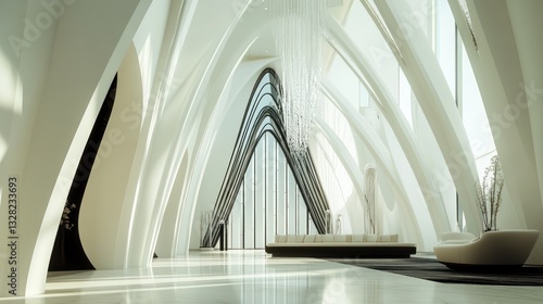 Fototapeta premium Modern lobby, curved walls, sunlight, waiting area, architectural design