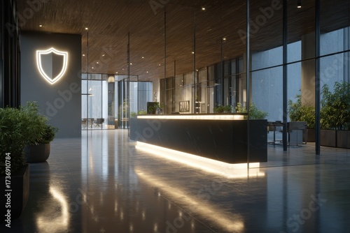 Obraz premium Modern Lobby with Illuminated Reception Desk and Shield Logo, Polished Floor...