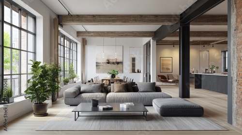 Fototapeta premium Modern loft apartment living room with exposed beams, large windows, and city...