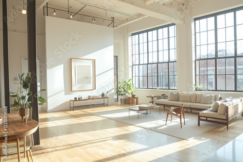 Fototapeta premium Modern Loft Apartment Sunlight Streaming Through Large Windows Bright...