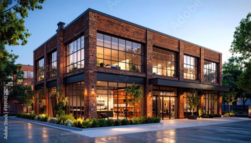 Fototapeta premium Modern Loft Building Brick and Glass Charm at Dusk.