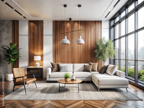 Fototapeta premium Modern Loft Living Room with White Walls and Wood Texture Panel - Spacious, Bright, and Minimalist Design Perfect for Contemporary Home Decor and Interior Inspiration