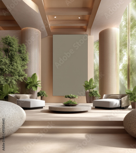 © visoot, Obraz premium Modern lounge with natural light, large columns, indoor plants, stone decor, and minimalist furniture creates calm, inviting atmosphere