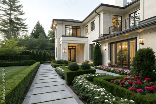 Naklejka premium Modern luxury home exterior with landscaped garden and walkway