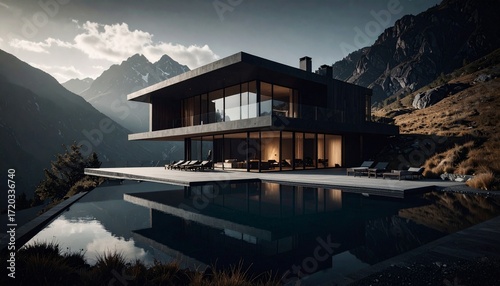 © Soleh, Fototapeta premium Modern luxury home with an infinity pool overlooking majestic mountain scenery.