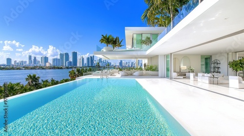 Naklejka premium Modern Luxury Home with Infinity Pool and City Skyline View