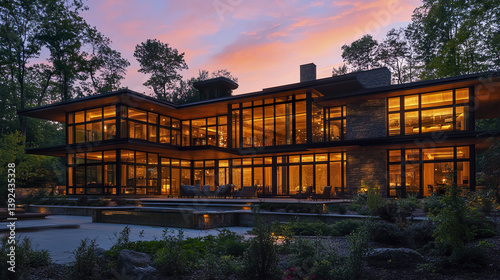 © Thanthara, Obraz premium Modern luxury home with large glass panels at sunset
