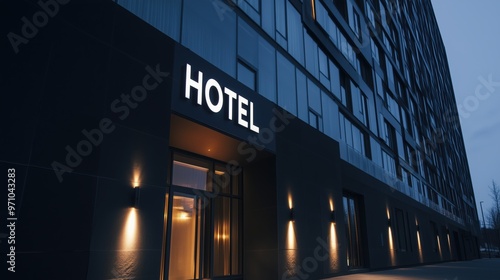 Obraz premium Modern luxury hotel facade at dusk with illuminated entrance for upscale...