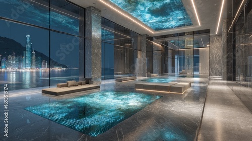 © Rafanial, Fototapeta premium Modern Luxury Hotel Lobby At Night With City View