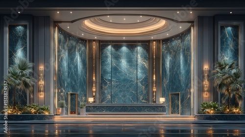 © Narongsag, Obraz premium Modern Luxury Hotel Lobby Night Entrance Teal Marble 8K