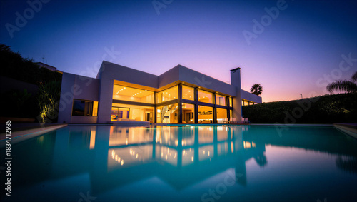 Fototapeta premium Modern Luxury House at Twilight | Illuminated Interior Reflected in Pool | Contemporary Residential Architecture Design