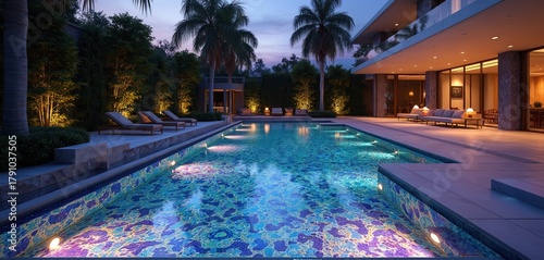 © Maryna, Fototapeta premium Modern luxury house backyard at night with large swimming pool. Pool features colorful tile mosaic, underwater lights creating glow. Palm trees, lounge chairs surround patio. Elegant home design